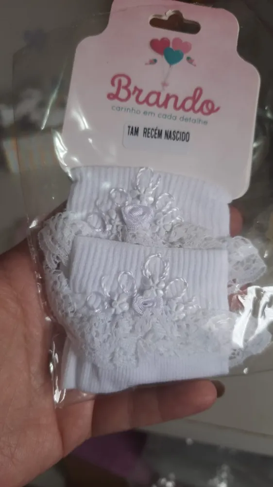 É uma meia muito graciosa que possui renda e um bordado delicado feito à mão!