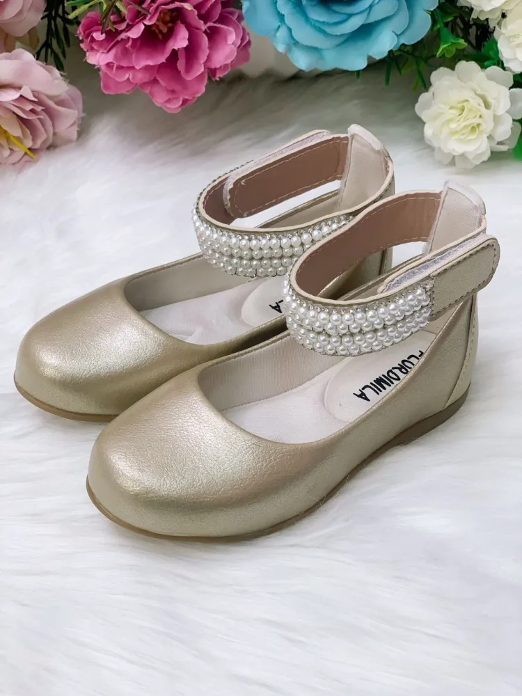 * Sapatinho infantil verniz, com tornozeleira, aplique de pérolas e strass. Fecho em velcro.