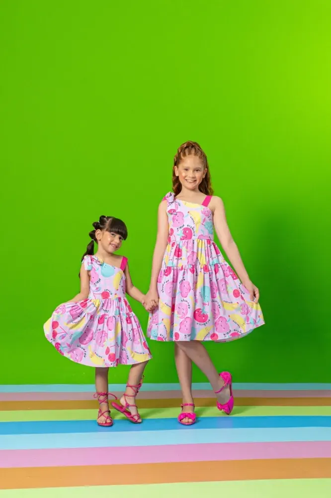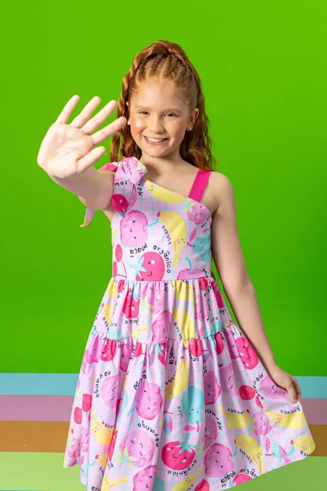 Olha que fofura esse vestidinho cheio de frutinhas! Colorido, leve e super confortável — perfeito pra brincar, passear e arrasar por aí!